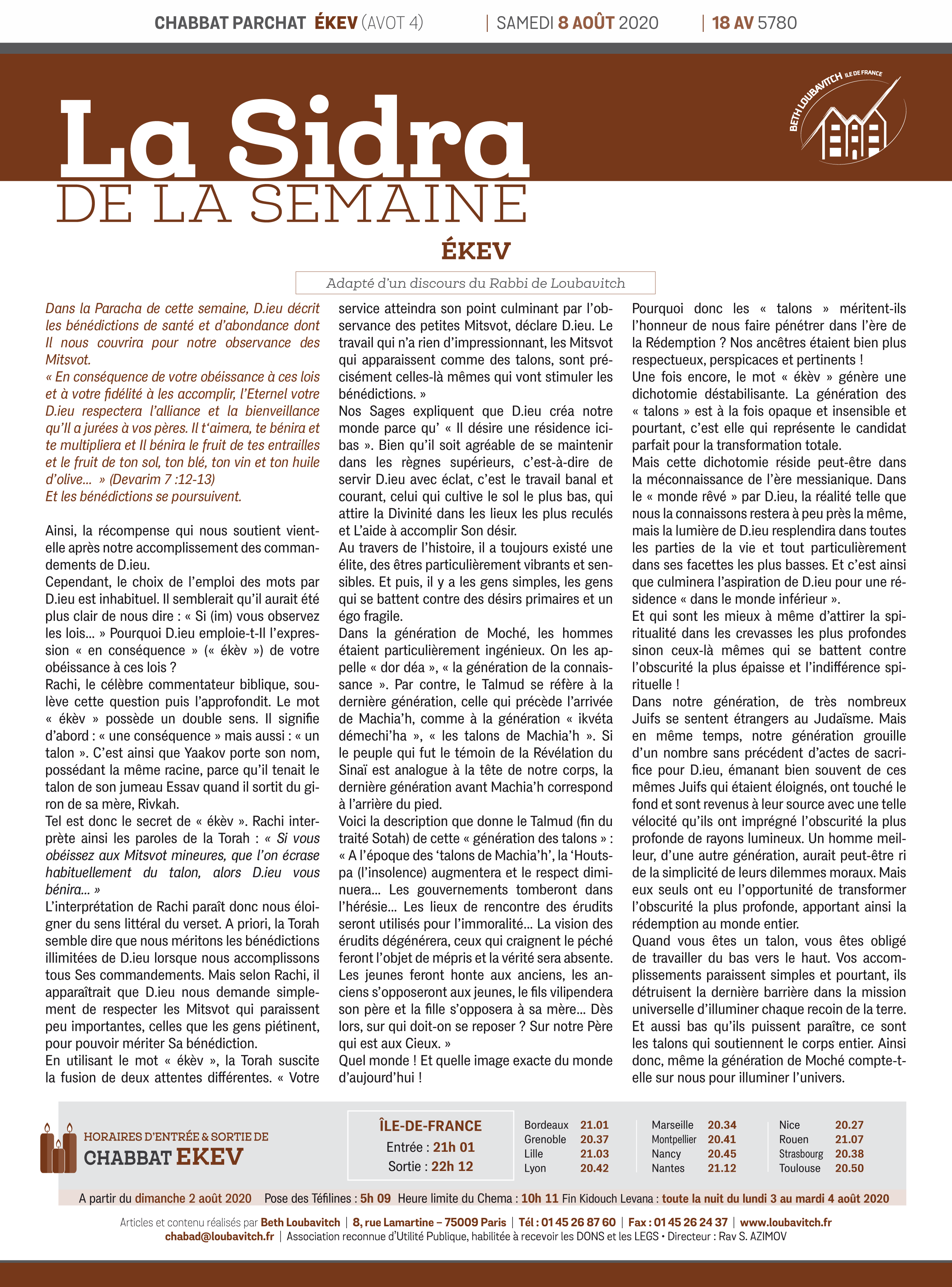 Tel est donc le secret de « ékèv ». Rachi interprète ainsi les paroles de la Torah : « Si vous obéissez aux Mitsvot mineures, que l’on écrase habituellement du talon, alors D.ieu vous bénira… »